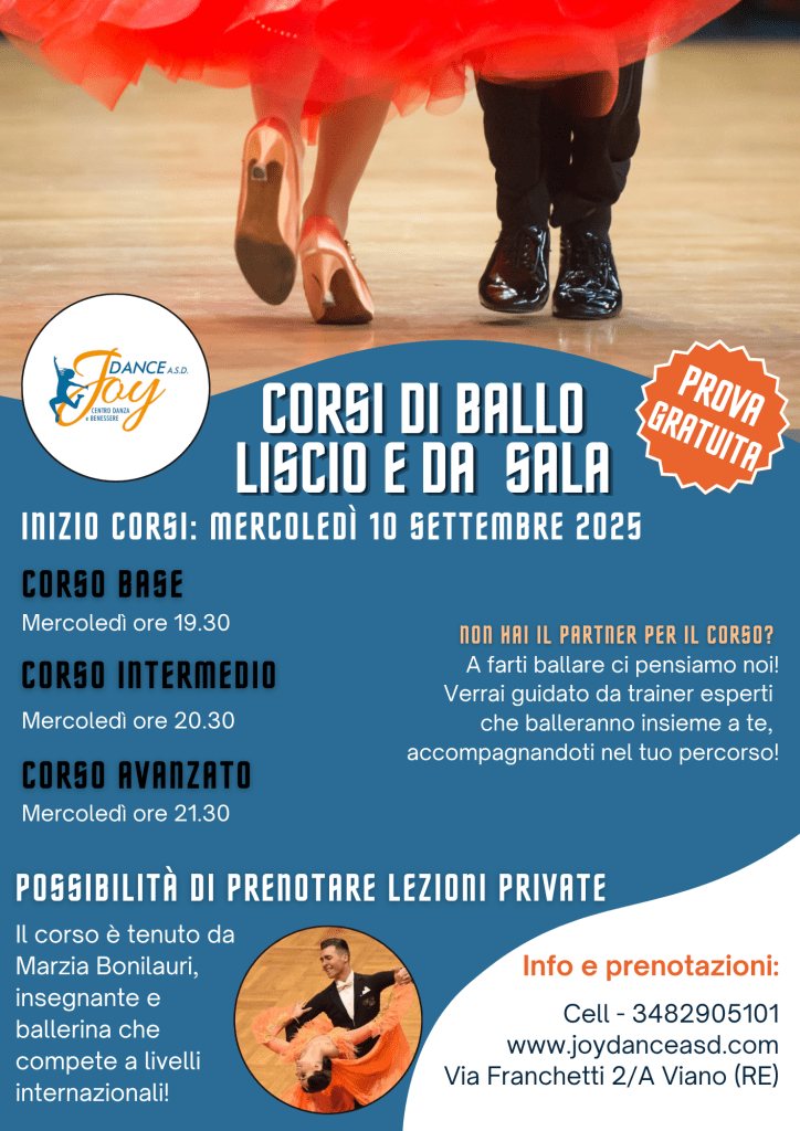 Valzer, Mazurca, Polka, Tango, Beguine, Valzer lento e Fox-trot. I balli più suonati nelle balere d’Italia in un unico corso. Dalle basi ai passi più complessi, questo è il corso perfetto per chi ha voglia di divertirsi ed imparare le danze tipiche della nostra tradizione. Non hai il partner per questo corso? Niente paura, lo troviamo noi!