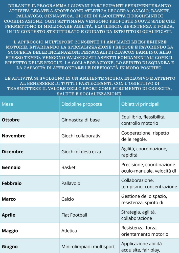 Novità della stagione 2024-2025 dedicata a bambini e ragazzi. Il Multisport nasce come corso “Multidisciplinare” per dare l’opportunità a tutti i bambini di praticare, sotto forma di gioco, diversi sport con un approccio non agonistico. Seguendo percorsi graduali e commisurati all’età, alle capacità e allo sviluppo motorio dei bambini, si pone l’obiettivo di far conoscere, provare e sperimentare diverse discipline prima di scegliere quello che potrebbe essere il loro percorso sportivo. La pratica della disciplina è destinata a bambini dai 6 anni e ragazzi.